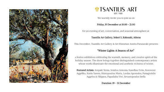 Για την εορταστική περίοδο, η Tsantilis Art Gallery παρουσιάζει την ομαδική έκθεση «Winter Lights: A Season of Art», μια επιμελημένη επιλογή έργων που φωτίζουν τη ζεστασιά, τη μνήμη και τη δημιουργική λάμψη του χειμώνα.